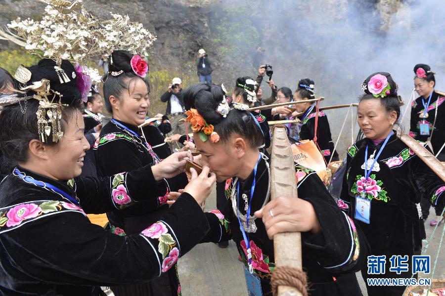 11月6日,在雷山县小固鲁村,寨子里的苗族女子给前来过年的“姑妈”敬酒。当日,贵州雷山县小固鲁村外嫁的妇女挑着鸡鸭鱼和糖果,抬着米酒,在寨子门口集合,集体回娘家,小固鲁村的娘家人吹起芦笙迎接,热闹非凡。嫁出的女儿集体回娘家过苗年,是苗族同胞世代传承的习俗。新华社发(陈沛亮 摄)