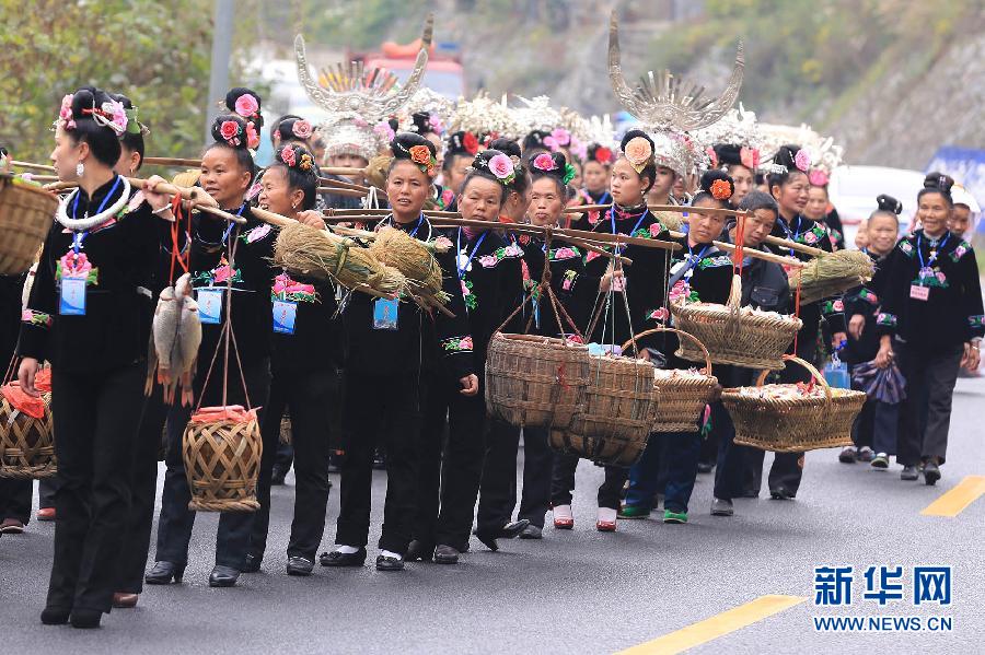 11月6日,雷山县小固鲁村“姑妈”回娘家过苗年。当日,贵州雷山县小固鲁村外嫁的妇女挑着鸡鸭鱼和糖果,抬着米酒,在寨子门口集合,集体回娘家,小固鲁村的娘家人吹起芦笙迎接,热闹非凡。嫁出的女儿集体回娘家过苗年,是苗族同胞世代传承的习俗。新华社发(吴吉斌 摄)