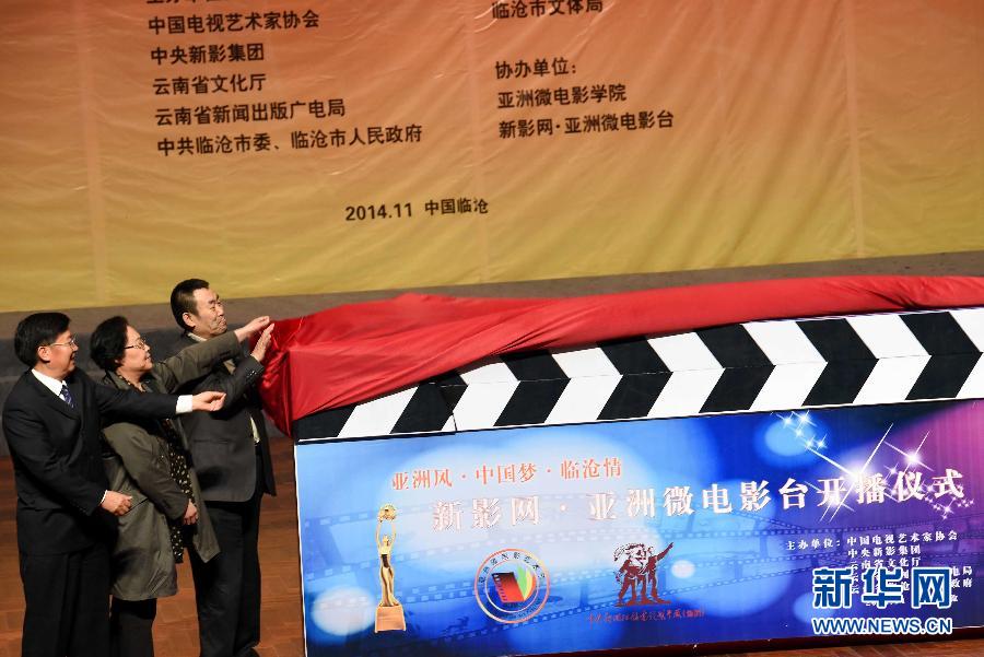 11月7日,电影工作者在为新影网·亚州微电影台开播仪式揭幕。当日,第二届亚洲微电影艺术节高峰论坛、金海棠奖颁奖典礼等活动在云南临沧亚洲微电影院举行。 新华社记者杨宗友摄