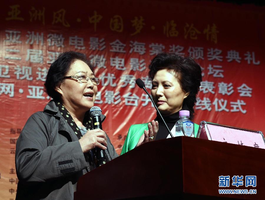 11月7日,电影演员斯琴高娃(左)在亚洲微电影艺术节上致辞。当日,第二届亚洲微电影艺术节高峰论坛、金海棠奖颁奖典礼等活动在云南临沧亚洲微电影院举行。 新华社记者杨宗友摄