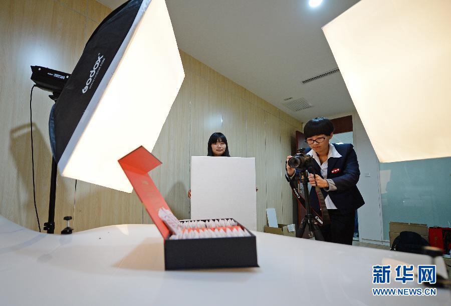 宁夏百瑞源公司员工在拍摄“双十一”促销的产品(11月6日摄)。一年一度的“双十一”网络购物高峰即将到来,各地电商纷纷采取仓库备货,推出各类优惠促销电子券等形式积极备战。 新华社记者 王鹏摄