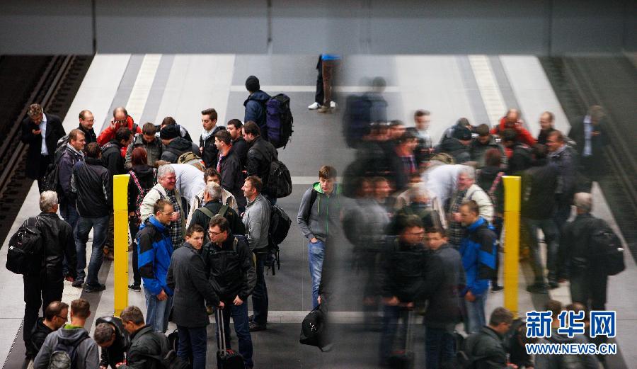 11月6日,在德国柏林中央火车站,旅客在站台上等待晚点的列车。由于劳资谈判破裂,德国铁路公司的货运列车司机当地时间5日下午开始全国罢工,客运列车司机6日起也停止工作。此次罢工将一直持续至10日,在此期间,德国长途、短途列车以及城市轻轨交通将受到影响。新华社记者张帆摄