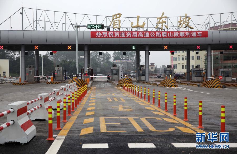 11月9日拍摄的四川遂资眉高速眉山市东坡收费站。当日,长约119公里的遂(宁)资(阳)眉(山)高速公路眉山段建成通车,标志着遂资眉高速全线通车。遂资眉高速全长247.41公里,是四川省高速公路网规划5横中的一条。起于遂宁市罗家湾,接遂渝高速公路,止于眉山市洪雅县止戈镇,接乐雅高速公路。其中,遂宁至资阳段已于2013年6月通车。新华社发(姚永亮 摄)