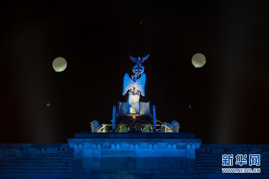11月9日,在德国柏林,标记柏林墙原址的气球飞过勃兰登堡门上空。 当日,德国首都柏林勃兰登堡门前举行活动,纪念柏林墙倒塌25周年。新华社记者张帆摄
