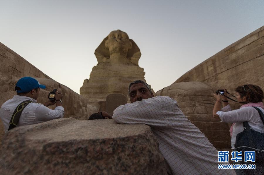 11月9日,在埃及吉萨省,景区工作人员在狮身人面像前看护。当日,埃及文物部邀请媒体走近已完成部分修复工程的著名古遗迹——狮身人面像,并宣布该石像基座周围关闭多年的院落即将恢复开放,游客将有机会近距离观赏该景观。这座近5000岁的狮身人面像又被称为斯芬克斯像,屹立在开罗近郊吉萨高地最大的金字塔附近。石像与吉萨3座大金字塔一起构成了吉萨旅游景区内的主要景观。新华社记者 潘超越 摄