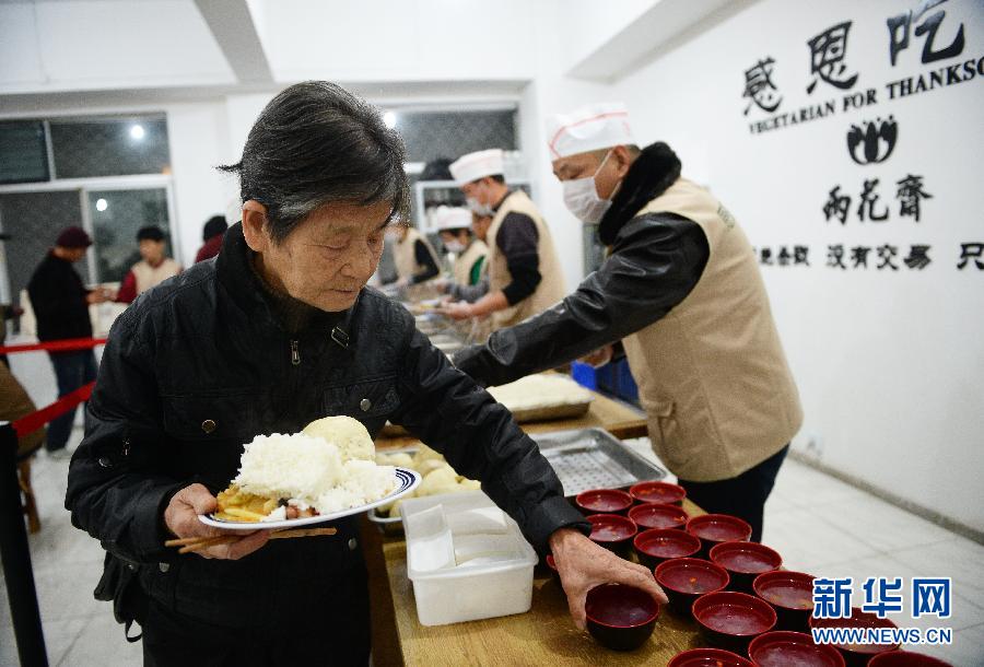 11月10日,市民在西安雨花斋餐厅排队领餐。近日,陕西西安首家免费素食互助餐厅在洒金桥劳武巷开业,每天中午11点到12点向市民提供免费素食午餐。据工作人员介绍,这家名为“雨花斋”的免费素食互助餐厅在全国各地共有八十多家店面,餐厅资金来自爱心人士捐赠,大厨及服务人员是社会上的义工,旨在传递爱心,为需要的人提供帮助。新华社记者 刘潇 摄