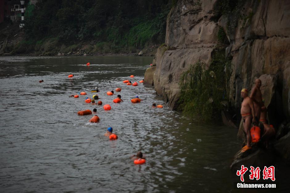 11月9日下午,重庆市九龙坡区建设码头边的九龙滩上,百余重庆冬泳爱好者摩拳擦掌后,脱掉全身衣裤,纷纷跳入刺骨的江水中——这是重庆立冬以来,第一次有组织的民间百人渡江运动。冬泳爱好者们在橡皮船的护送下,游过近6百米的长江河道,顺利渡江成功的有76人,在对岸经过短暂休息后,在从江中返回出发点。重庆冬泳爱好者集中下水的码头有多处,其中,建设码头这处最特别。每到下午3点,建设码头旁的一处弯道内,就有数十个男子纵身跃进江中,他们几乎都不穿泳裤,赤条条地挥动手臂,畅快地游泳。这里被外界称为“裸泳滩”,裸泳爱好者们则将自己叫做“九龙滩裸泳队”。这次集体裸泳渡长江是他们组织的第三次活动。中新社发 渝友 摄