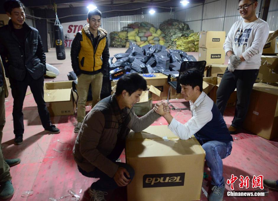 11月9日,在江西九江市一家快递公司,工作人员正在工作间隙扳手腕减压。在双十一前夕,江西九江市一家快递公司在仓库设立减压区,挂起沙袋供快递工作人员发泄,缓解他们在双十一期间的工作压力,平息烦躁情绪。中新社发 胡国林 摄