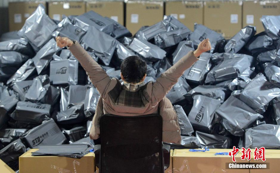 11月9日,在江西九江市一家快递公司,工作人员正在工作间隙伸懒腰。在双十一前夕,江西九江市一家快递公司在仓库设立减压区,挂起沙袋供快递工作人员发泄,缓解他们在双十一期间的工作压力,平息烦躁情绪。中新社发 胡国林 摄