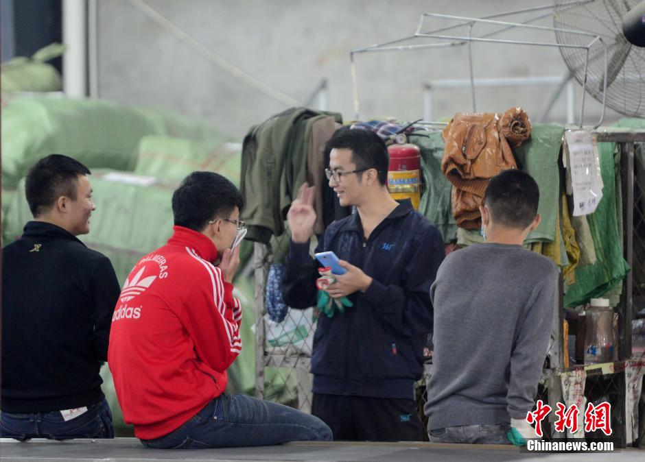11月9日,在江西九江市一家快递公司,工作人员正在工作间隙聊天。在双十一前夕,江西九江市一家快递公司在仓库设立减压区,挂起沙袋供快递工作人员发泄,缓解他们在双十一期间的工作压力,平息烦躁情绪。中新社发 胡国林 摄