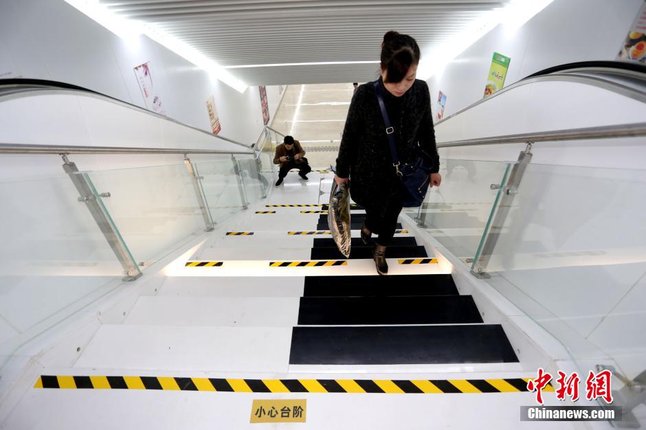 11月10日,河南郑州地铁1号线会展中心出站口,行人走在可“弹”音乐的“钢琴楼梯”上。这里的26级黑白上下台阶随着人走在上面,台阶灯光会短暂亮起,同时发出悦耳的声音,如同一台巨大的钢琴。设计者李利君介绍,每个大理石台阶下方均提前设定好音阶,安装有感应装置,当人行走在上面时,感应器就会识别,通过多次踩踏便能发出悦耳动听的钢琴旋律,总体设计原理与钢琴相似。中新社发 杨正华 摄