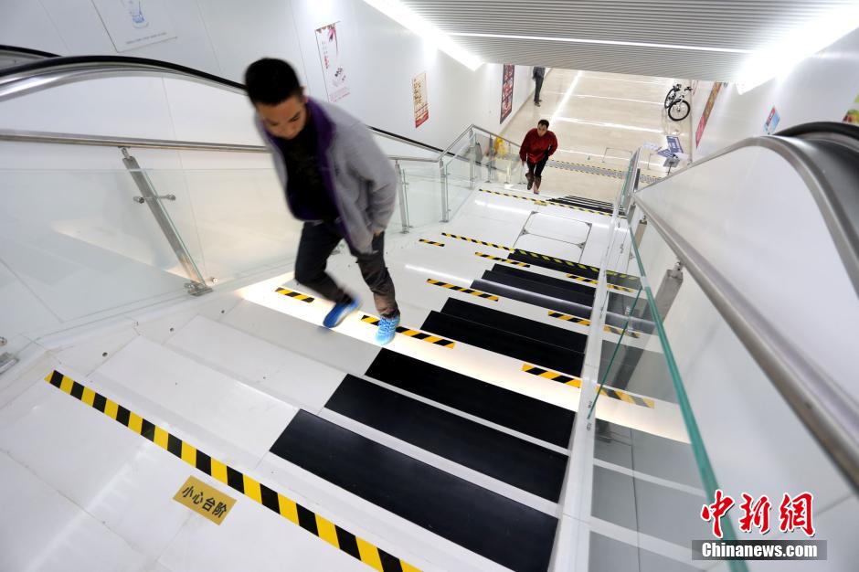 11月10日,河南郑州地铁1号线会展中心出站口,行人走在可“弹”音乐的“钢琴楼梯”上。这里的26级黑白上下台阶随着人走在上面,台阶灯光会短暂亮起,同时发出悦耳的声音,如同一台巨大的钢琴。设计者李利君介绍,每个大理石台阶下方均提前设定好音阶,安装有感应装置,当人行走在上面时,感应器就会识别,通过多次踩踏便能发出悦耳动听的钢琴旋律,总体设计原理与钢琴相似。中新社发 杨正华 摄