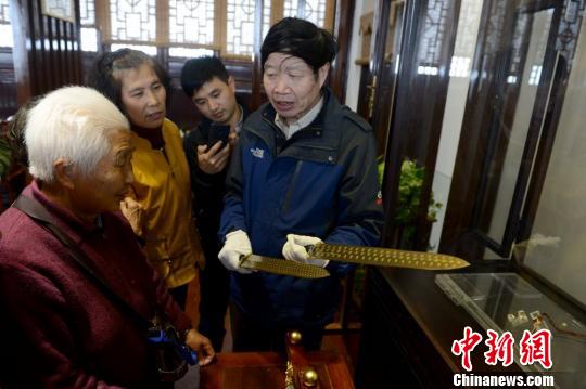 金海鸥向市民介绍他所铸造的“干将”、“莫邪”宝剑。王思哲 摄