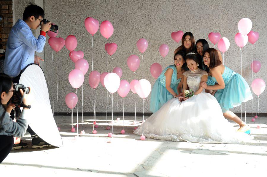 娇娇在众多伴娘的陪伴下拍摄婚纱照。