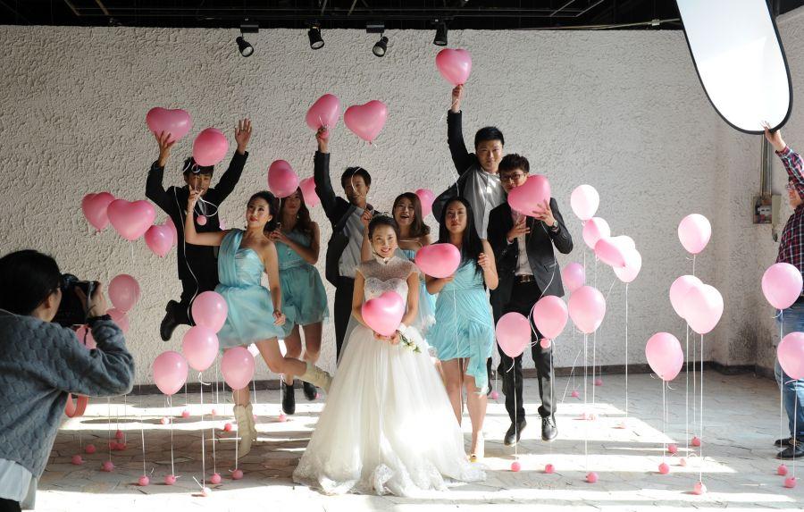 娇娇在众多伴娘、伴郎的陪伴下拍摄婚纱照。现在大家都希望她能找到合适的肾源,有人能帮帮她,留住这青春又美丽的生命,让她的幸福更长久一些。