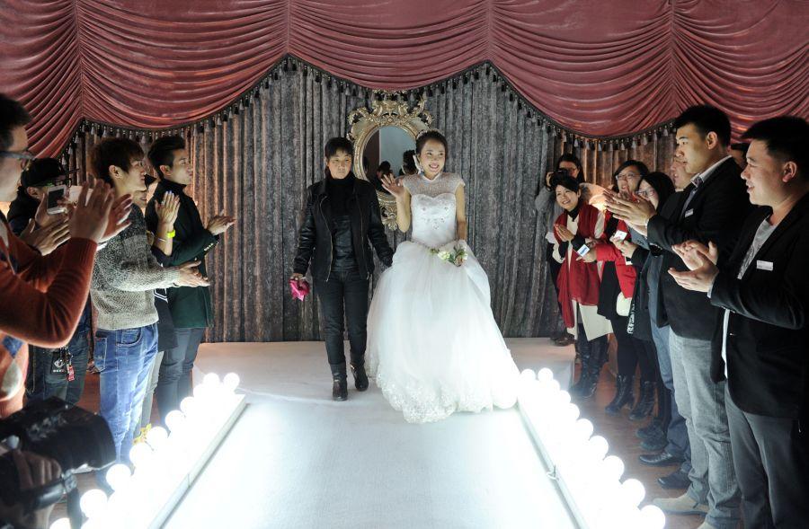两个小时的拍摄结束后,在3楼还有一个惊喜在等着娇娇。在伴娘的陪伴下,娇娇被用红色丝带蒙住眼睛,她缓缓走上专门为她搭建的幸福舞台。舞台四周围满了来参加这场特殊“婚礼”的好心观众。幸福的泪水肆意流淌,这是这些年来娇娇第一次,也是唯一一次。这一天,在这个舞台上,她是最美的“新娘”。虽然,从头到尾没有新郎。但娇娇说,她很高兴,自己的梦圆了。 娇娇穿着婚纱,在妈妈的陪伴下走上舞台,接受了众多好心人的祝福。
