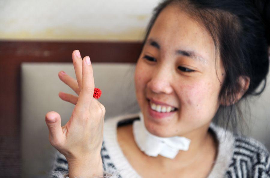 一个好心人送给娇娇一枚装饰戒指,娇娇很喜欢,戴在手上,不时地看看。