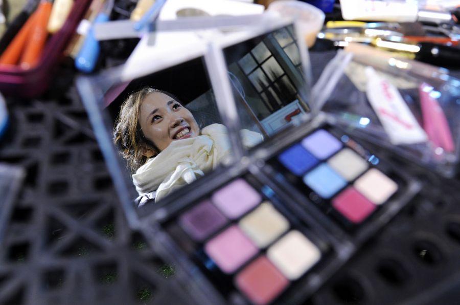 化妆师在给娇娇化妆,娇娇露出了开心的笑容。