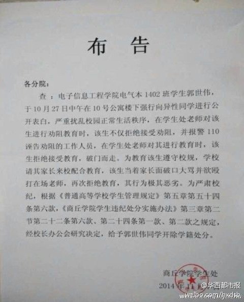 据华西都市报官方微博11月10日报道,河南商丘学院一份“布告”在网上流传,“布告”称该校男生郭某“强行”向异性表白,严重扰乱校园秩序,校方依据相关规定给予郭某开除学籍处分。