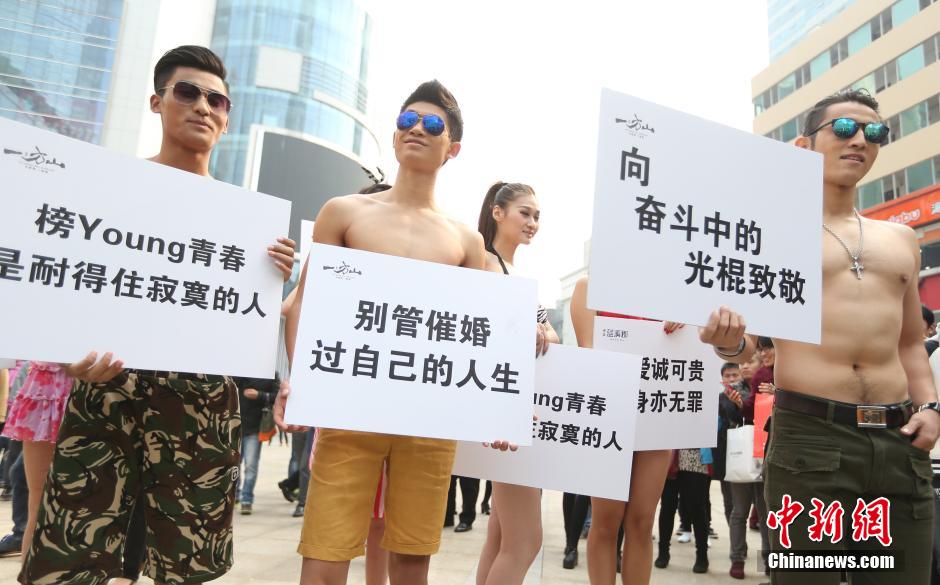 11月11日是“光棍节”,南京某地产商请来着清凉夏装的帅哥靓女搞起行为艺术秀,手举写有“恋爱诚可贵,单身亦无罪”、“别管催婚,过自己的人生”、“向奋斗中的光棍致敬”等字样的牌子走上街头,公开“挑战脱单”,引发市民围观。中新社发 泱波 摄