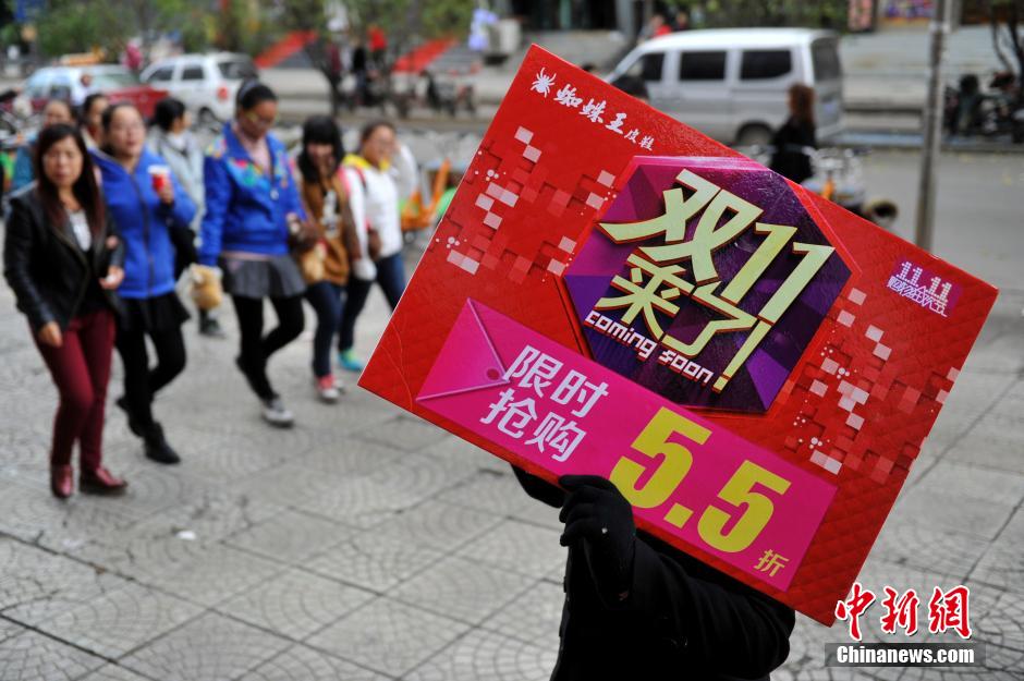 11月11日,山西太原,实体商家进行打折促销活动吸引消费者。当日,电商交易平台火爆,实体商家也不甘落后,使出浑身解数与电商抢生意。中新社发 武俊杰 摄