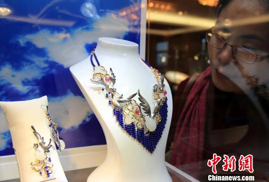 图为在11月11日举行的2014中国国际珠宝展新闻发布会上,展出了即将参加本次展览中国金镶玉设计大赛的参赛作品。赵隽 摄