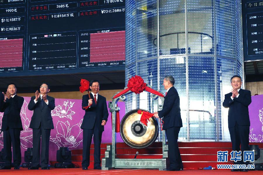 11月17日上午9时30分许,中共中央政治局委员、上海市委书记韩正(左三),中国证监会主席肖钢(右二)共同为上海证券交易所当日交易鸣锣开市,标志着作为资本市场重大制度创新的沪港通正式启动,沪港两地证券市场成功实现联通。新华社记者 陈飞 摄