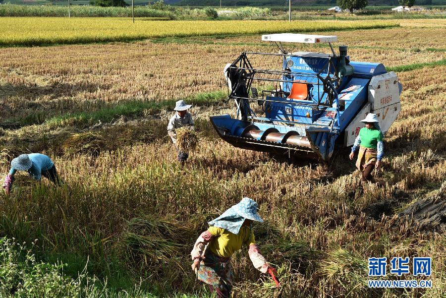 11月16日,勐海县勐遮镇曼腊玛村村民在收割晚稻。11月中旬,位于云南省西双版纳傣族自治州的国家商品粮生产基地勐海县三十万亩晚稻收割进入尾声。2014年当地政府积极宣传落实粮食种植直补政策,努力调动农民种粮积极性并及时兑现农民粮食直补款,广大农民将丢荒的土地重新开垦种上水稻,扩大了水稻种植面积。当地农业部门预计今年晚稻将获得大面积增产增收,平均亩产量将达到450公斤。新华社记者 陈海宁 摄