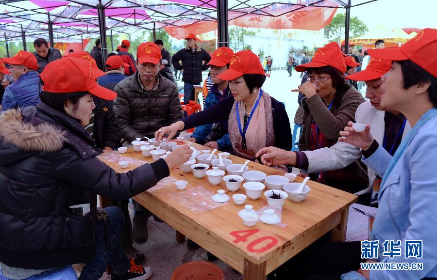 11月16日,客商在斗茶活动上品茗。当日,第八届海峡两岸茶业博览会在福建武夷山开幕。海峡两岸上千名茶人和游客聚集武夷山,举行“海峡两岸民间斗茶”活动。 新华社记者 张国俊摄