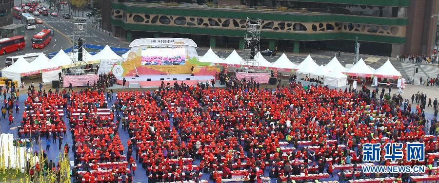 11月16日,中国游客在韩国首尔市政厅广场制作韩国泡菜。 当日,上千名中国游客在首尔市政厅广场共同制作韩国泡菜,体验韩国传统文化。新华社记者姚琪琳摄