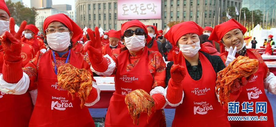 11月16日,在韩国首尔,中国游客展示亲手制作的泡菜。 当日,上千名中国游客在首尔市政厅广场共同制作韩国泡菜,体验韩国传统文化。新华社记者姚琪琳摄