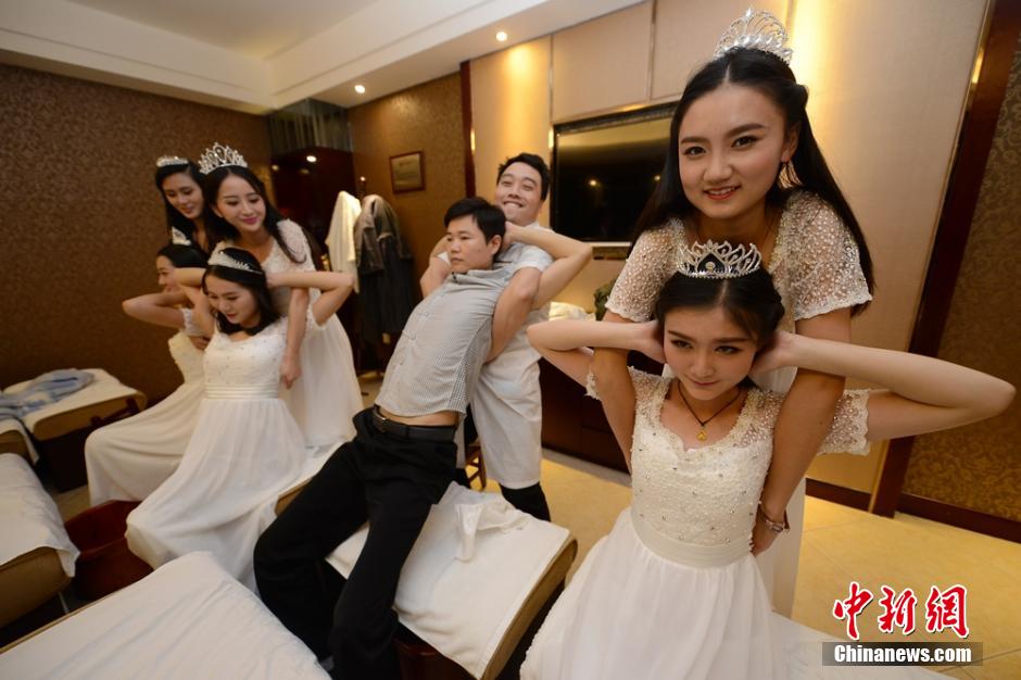 11月16日,世界旅游文化小姐湖南十大校花见面会在长沙举行。十位校花来到长沙一足浴店学习理疗按摩,用这种方式倡导健康的养身方式。 杨华峰 摄
