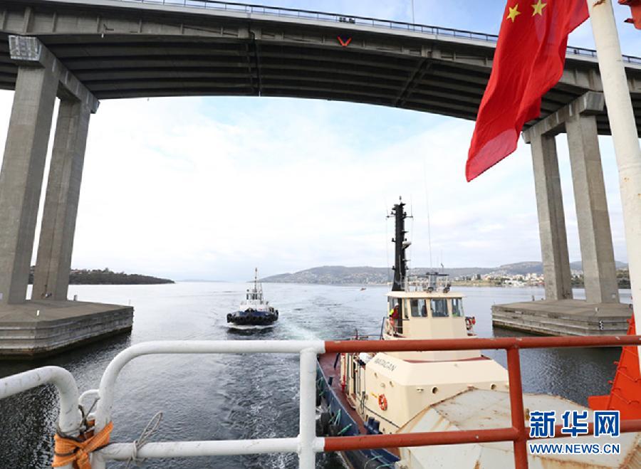 11月16日上午,“雪龙”号通过澳大利亚霍巴特标志性建筑塔斯曼大桥。