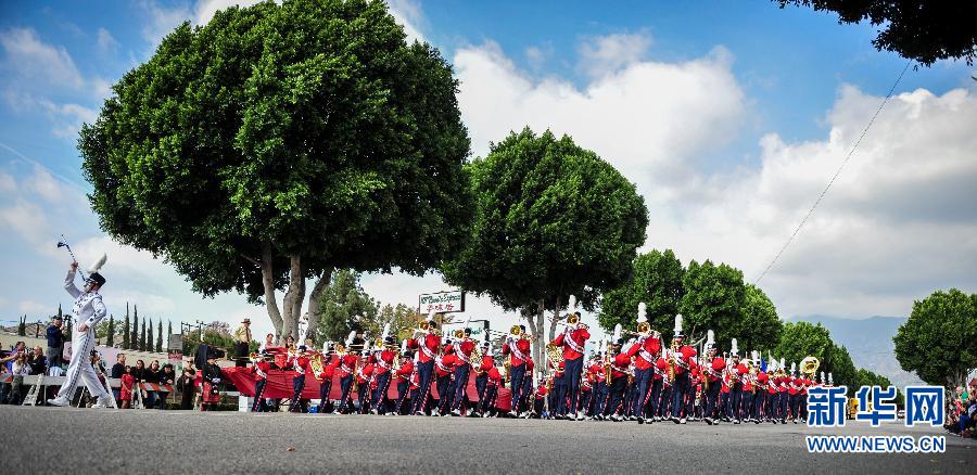 11月15日,美国洛杉矶一所中学的军乐队参加第61届校园军乐队游行节活动。当日,来自洛杉矶五十余所中学的校园军乐队汇集在阿卡迪亚市鲍德温大街,参加第61届校园军乐队游行节。当地居民和学生家长早早来到街道两旁,欣赏表演并为孩子打气助威。新华社记者 张超群 摄