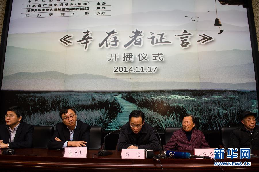 11月17日,南京大屠杀幸存者陈德寿(右一)、夏淑琴(右二)参加《幸存者证言》开播仪式现场。当日,由侵华日军南京大屠杀遇难同胞纪念馆和江苏新闻广播联合制作的《幸存者证言》正式开播,该节目用声音向公众播放30位南京大屠杀幸存者的口述证言。新华社记者 李响 摄