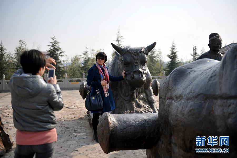 11月15日,游客在黄河大铁牛前拍照留念。新华社记者 王飞航 摄