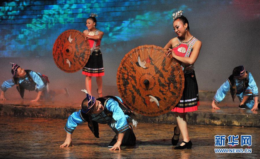 11月15日晚,在广西三江侗族自治县“侗乡鸟巢”剧场,来自湖南城步苗族自治县的演员在表演民族舞蹈《苗伞传情》。当晚,第三届中国大桂林·桂湘原生态民族风情节在广西三江侗族自治县开幕。广西柳州市三江侗族自治县、广西桂林市龙胜各族自治县、湖南邵阳市城步苗族自治县、湖南怀化市通道侗族自治县通过极具民族特色的舞蹈节目,展示当地风情,推进民族地区旅游业发展。新华社记者 李斌 摄