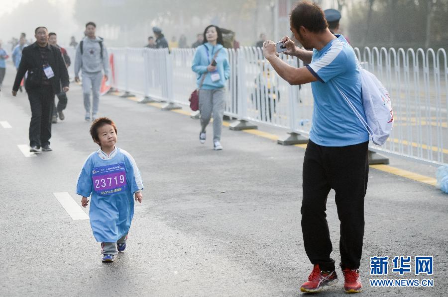 11月16日,一位家长(右)带着孩子参加亲子组的比赛。当日,2014合肥国际马拉松赛在合肥市渡江战役纪念馆开跑,共有来自21个国家及地区的逾万名选手参加4个项目的角逐。 新华社记者张端摄