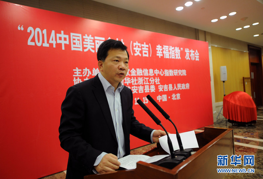 11月15日,新华社副社长慎海雄在发布会上讲话。当日,由国家金融信息中心指数研究院研发和编制的中国美丽乡村(安吉)幸福指数在北京发布。该指数旨在系统评价中国美丽乡村创建能力和水平,促进美丽乡村先进模式推广发展。新华社记者 马研 摄