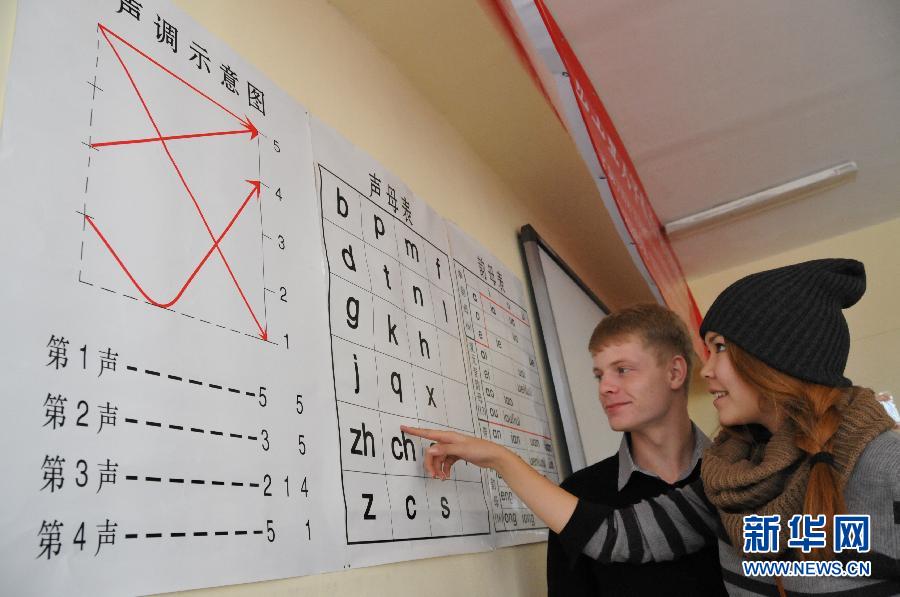 11月14日,在吉尔吉斯斯坦比什凯克,第一批吉尔吉斯斯坦国立工业大学孔子课堂培训班的吉尔吉斯斯坦学员在教室中学习拼音声母表。当日,吉尔吉斯斯坦国立工业大学孔子课堂正式揭牌。据了解,该孔子课堂是吉尔吉斯斯坦比什凯克人文大学孔子学院下设的孔子课堂。该课堂将开设3个班,每天进行一个课时的培训,一周5天。目前注册学生达150人。培训内容将从汉语语音开始,逐步深入。新华社发(罗曼摄)