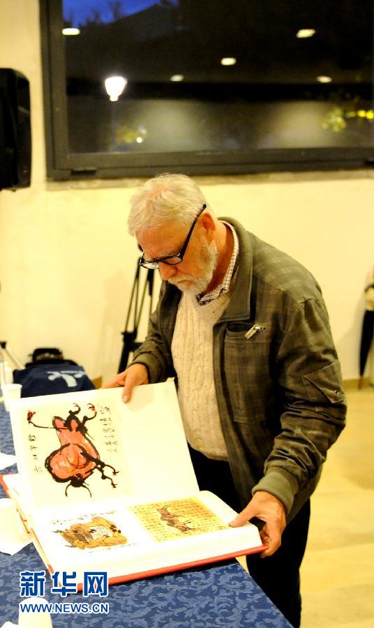 11月13日,在意大利托斯卡纳大区的菲耶索莱,一名意大利读者在翻看著名画家黄永玉的作品集。当日,著名画家黄永玉在意大利佛罗伦萨附近的菲耶索莱小镇出席了其著作《从塞纳河到翡冷翠》的意大利语版发布会,该书讲述了黄永玉多年前从巴黎到佛罗伦萨一路进行绘画创作的艺术旅程。新华社记者许逆之摄