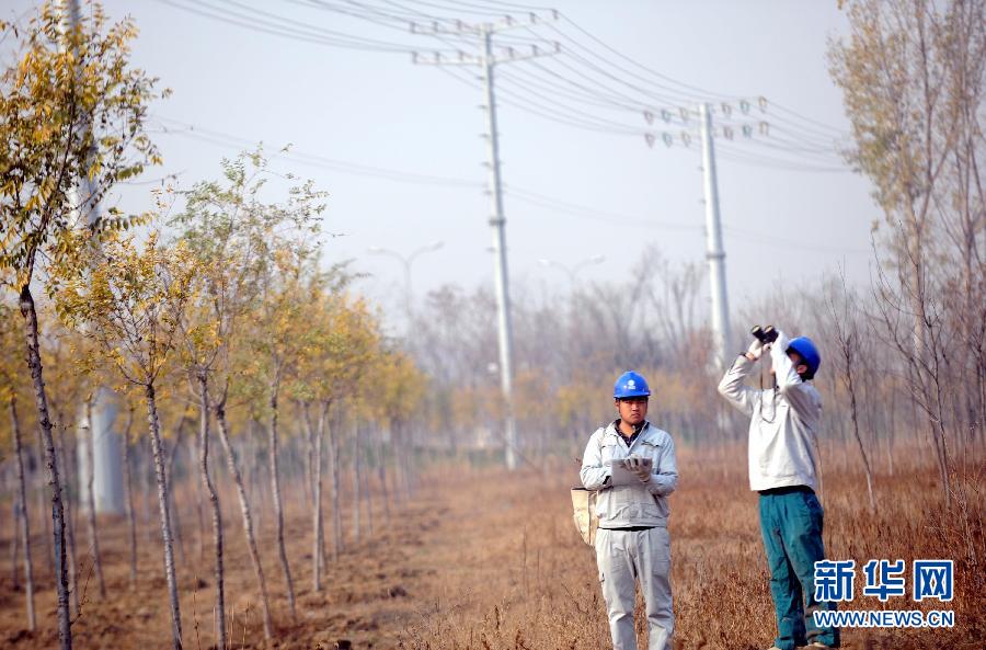 11月15日,冀北大厂回族自治县供电公司邵府供电所员工在杆塔下用望远镜巡视检查线路。冬季用电高峰将至,冀北大厂回族自治县供电公司全面部署,详细制定迎峰度冬保电方案,增加巡视检查力度,做好负荷预测,切实提高县域电网供电及应对自然灾害的能力,确保电网安全可靠供电和市民冬季用电安全。新华社记者 李晓果 摄