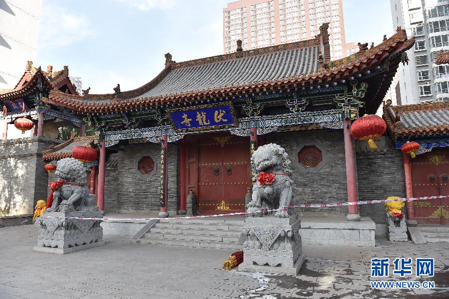 太原伏龙寺正门(11月14日摄)。 11月14日凌晨,位于太原市义井街的伏龙寺发生火灾,寺内后殿被烧毁。目前,大火已被扑灭,火灾原因和损失正在调查中。据了解,伏龙寺为仿古建筑,是义井村村民自筹资金于2008年新建,原寺庙已无任何遗存。 新华社记者 詹彦 摄