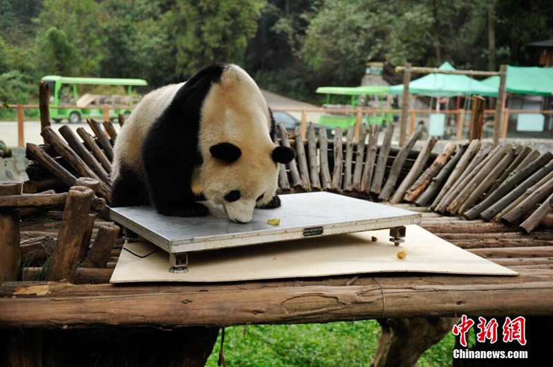 11月13日,云南野生动物园的大熊猫思嘉搞完破坏之后向周围的观众卖萌。当日,云南野生动物园计划为大熊猫思嘉测体重,但聪明的思嘉却不肯配合饲养员而搞起破坏,咬断电子称显示屏的连接线,让动物园的体检计划泡了汤。中新社发 刘冉阳 摄