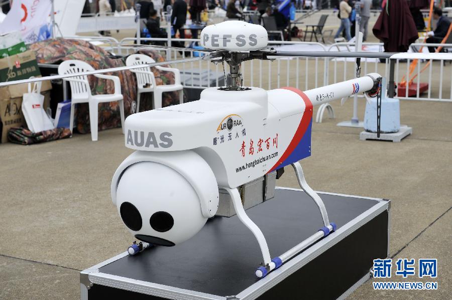 这是青岛企业自行研发制造的曙光5-A-01伞降民用无人直升机,该无人机使用独特设计的“降落伞应急故障安全系统”,遇到突发事件时可有效实现无人机伞降(11月13日摄)。在第十届中国国际航空航天博览会上,数十款国产无人机成为航展上备受关注的焦点。WJ-600无人机、“翼龙”无人机系统、彩虹4无人机系统等明星机型纷纷亮相。此外,多款民用无人机同台竞技,民营企业大举进军无人机市场也成为今年航展的新亮点。新华社记者 梁旭 摄