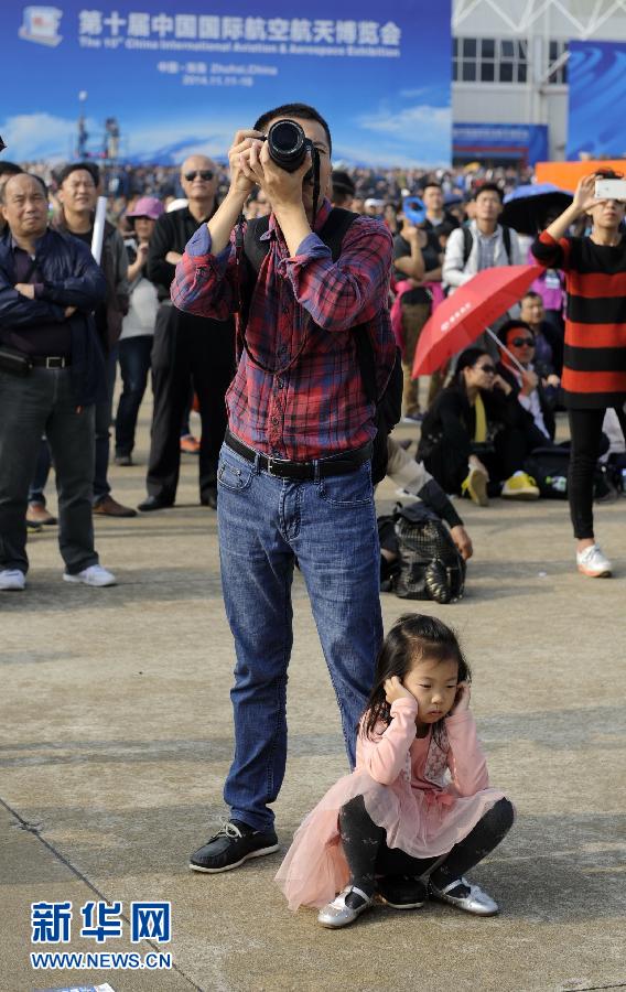 11月14日,在航展现场,参加表演的飞机发出巨大轰鸣声,一名小女孩捂住了耳朵。 当日,第十届中国国际航空航天博览会迎来首个公众开放日。新华社记者梁旭摄