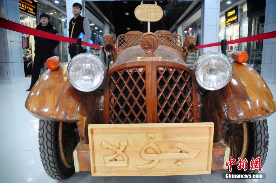 11月17日,一辆木制敞篷车被摆放在乌鲁木齐市一商场入口。据商场工作人员介绍,该车车身用木头打造,天气晴好时放在室外供人观赏,雨雪天气就在室内展示,这车是电动车,虽能上路行驶,但主要用途是观赏、展览。中新社发 马新龙 摄