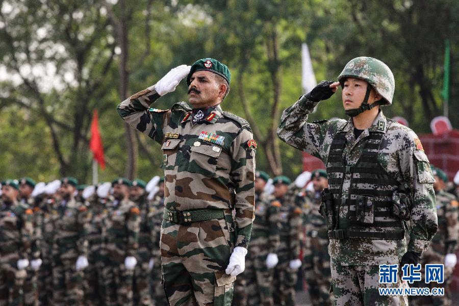 当日,“携手—2014”中印陆军反恐联合训练开训仪式在印度马哈拉斯特拉邦浦那市奥恩德军营举行。在随后的10天里,双方将采取体验教学、示范观摩、混编同训等方式,组织基础体能、战术手语、入室清剿和简易爆炸物搜索与排除等课目训练,按照战场监视、立体封控、营救人质、联合歼击、追捕搜剿的步骤实施城镇反恐联合实兵演练。新华社记者郑焕松摄
