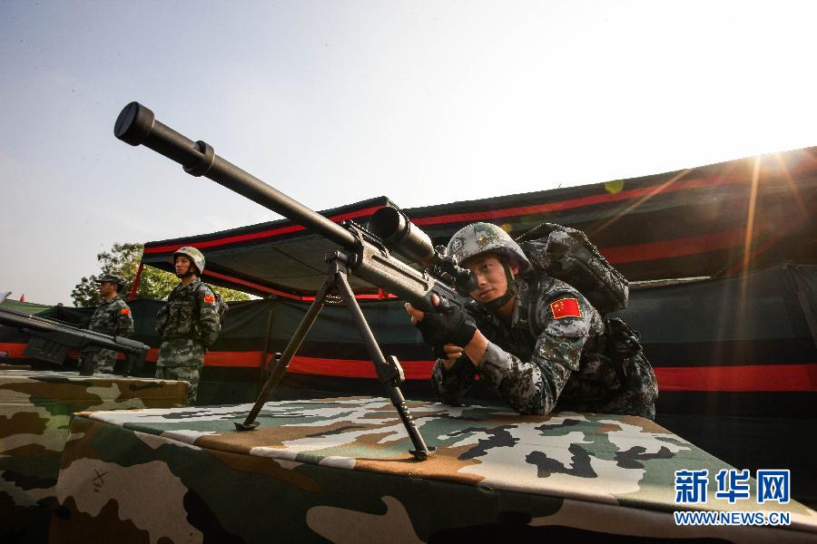 11月17日,在印度浦那的奥恩德军营,一名中国士兵在“携手—2014”中印陆军反恐联合训练开训仪式上展示中国反恐武器装备。
