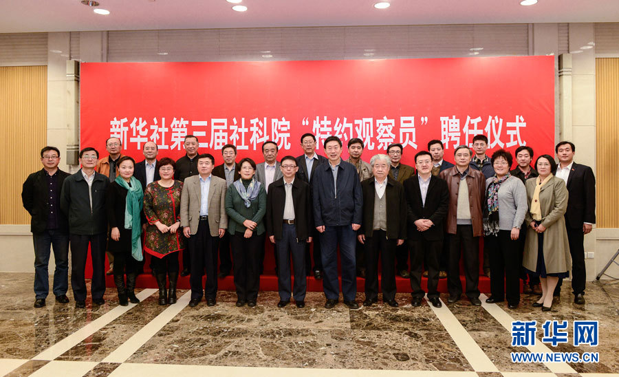 11月17日,部分受聘“特约观察员”和参加聘任仪式的领导合影。当日,新华社聘请中国社会科学院41名专家学者为“特约观察员”,聘期为两年,这已是新华社第三次与社科院开展合作。这41名“特约观察员”全部来自社科院,其中有学部委员7人,荣誉学部委员1人,研究员39人,助理研究员1人,分别来自经济、国际、政法、历史等学部和院机关,涉及世界经济、国际关系、区域经济一体化、中东政治、国际贸易、反恐、两岸关系、城镇化、人力资源、农村改革、财政、城市竞争力、房地产、旅游等十几个领域。 2010年4月新华社与社科院建立“特约观察员”机制。在各类报道中,新华社记者就国内外重要问题、突发事件、热点焦点问题对受聘专家进行采访和专题访谈,受聘专家也可应约或主动撰写评论、新闻分析等参考类文章供新华社选用。新华社记者李贺摄